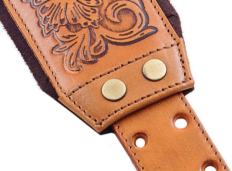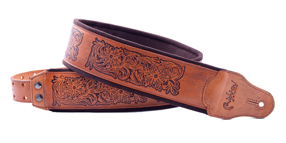 Correa para guitarra y bajo de fabricación española hecha en piel de bovino de primera calidad pintada a mano en color woody y decorada con grabados de estilo charro, con forro de microfibra con portapúas integrado, acolchado de látex de alta densidad y licra y sistema de ajuste RAS.