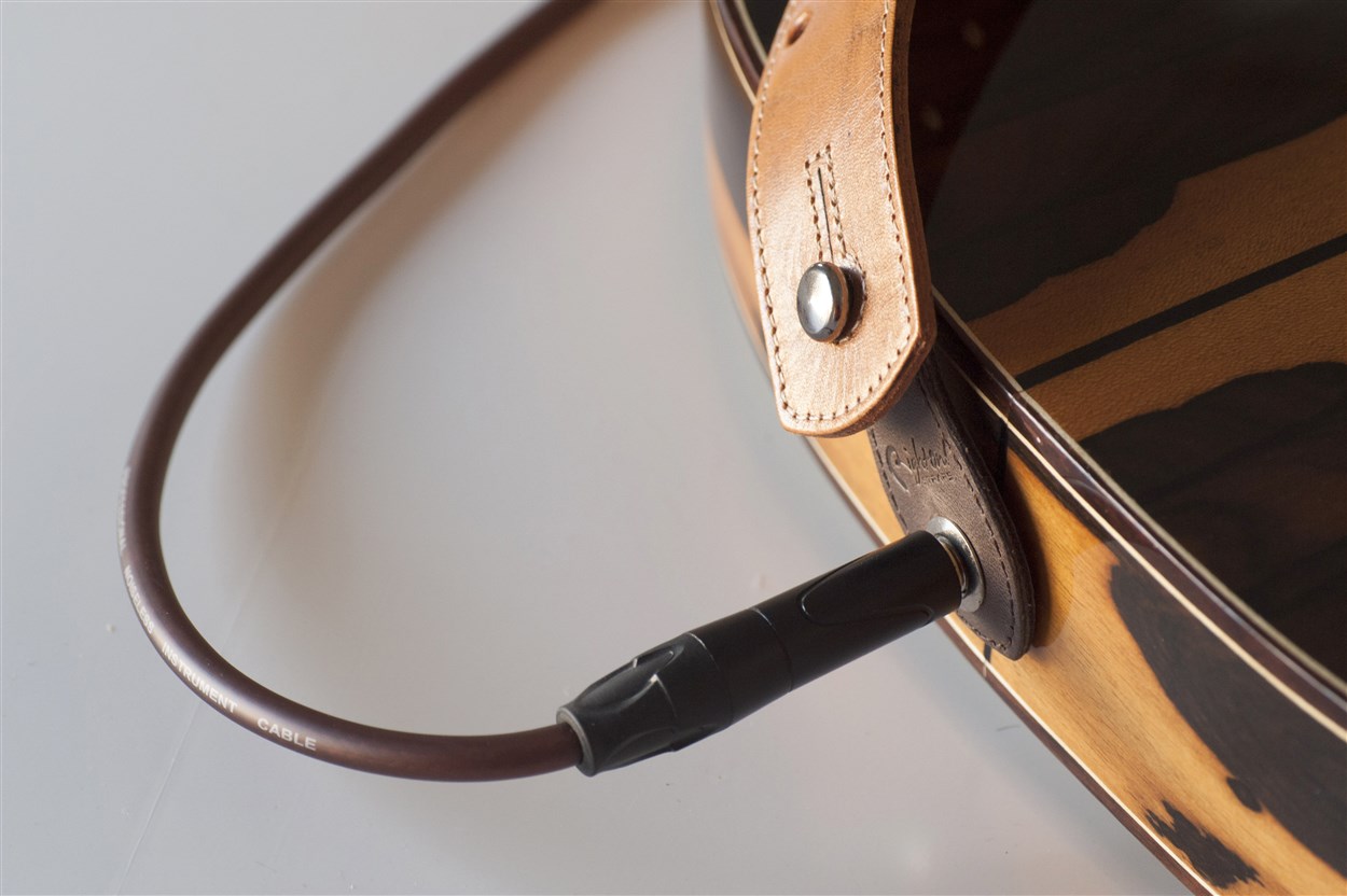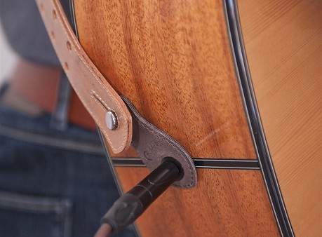 Es ist fast unmöglich, einen dicken Gitarrengurt durch die Befestigungsstifte der Ausgangsbuchse zu fädeln. Diese Lösung, die oft bei Akustikgitarren verwendet wird, dient als Adapter zwischen der Ausgangsbuchse der Gitarre und deinem normalen Gurt, sodass er leicht anzubringen ist.