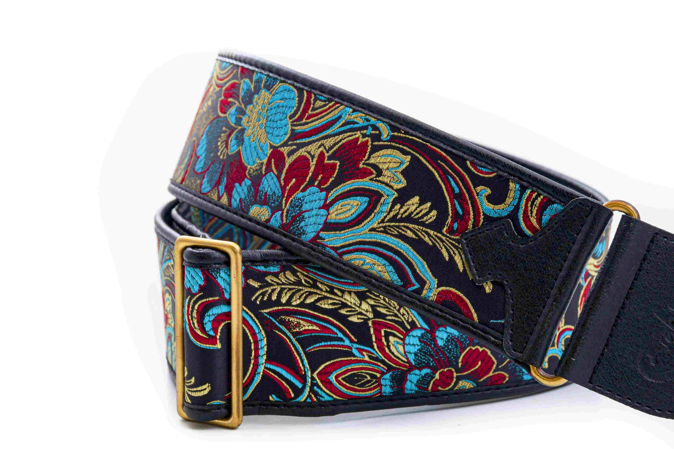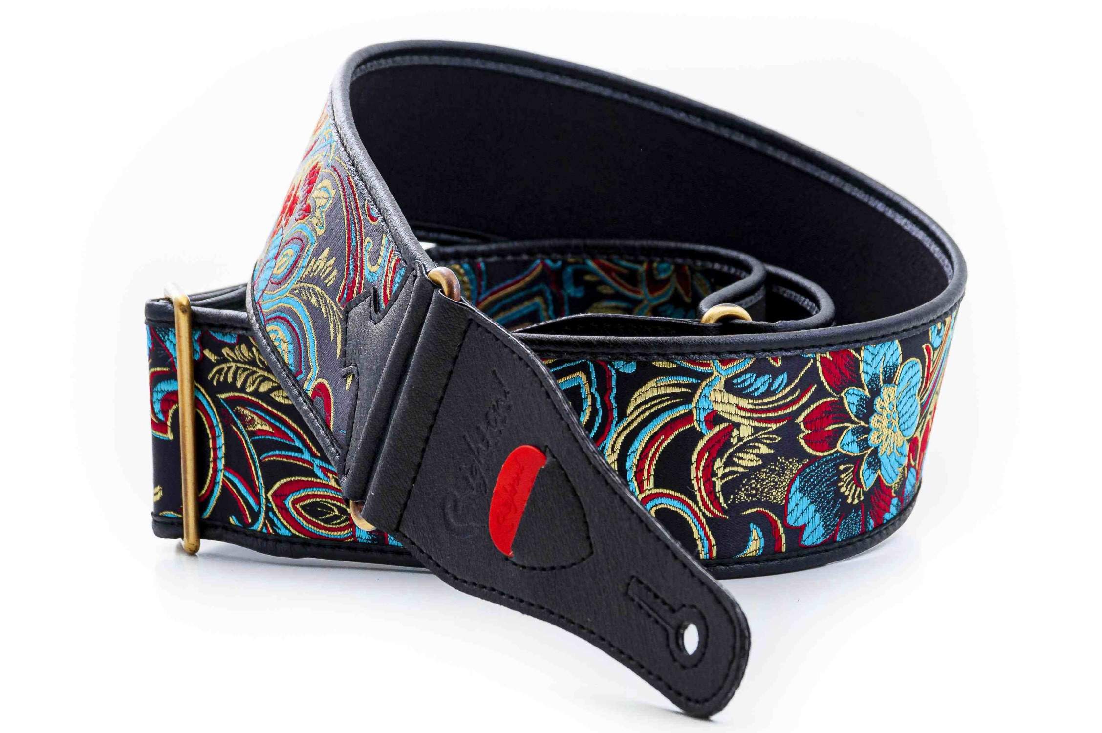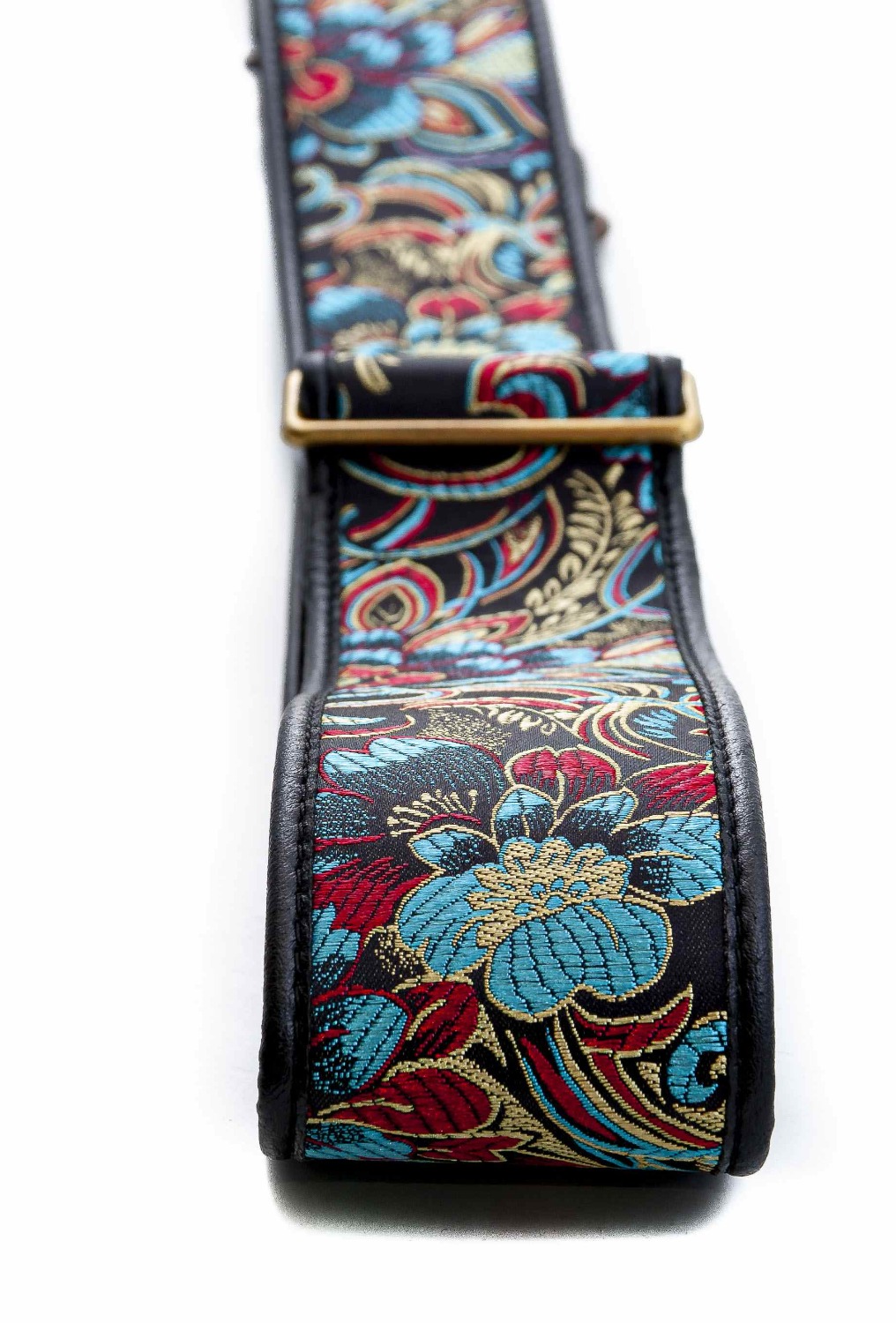 Beppu II Guitar Strap: Beppu (別府市; Beppu-shi) is the Japanese city of hot springs, known for its "hells on earth" and its unique baths found nowhere else in the world. Beppu boasts the largest number of "onsen" (steam vents rising from the earth) in all of Japan, as well as the highest volume of hot water globally. We wanted to dedicate a guitar strap to this fascinating place and found a spectacular fabric that captures that characteristic Japanese style. This strap, with its black background and embroidered botanical motifs, is an absolute beauty, capable of enhancing even the simplest guitar, if one ever considers their guitar plain ;) And if that's the case, this strap will certainly make your guitar look much more elegant.