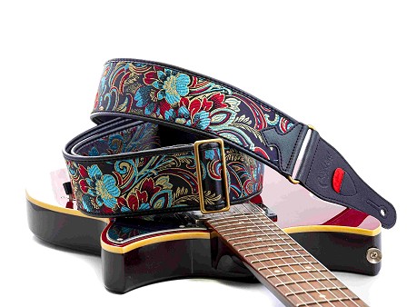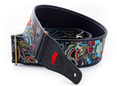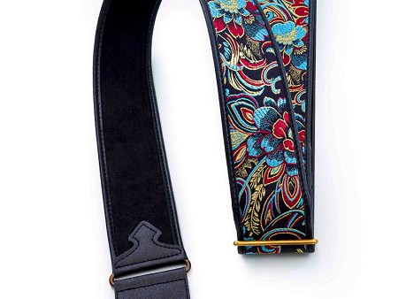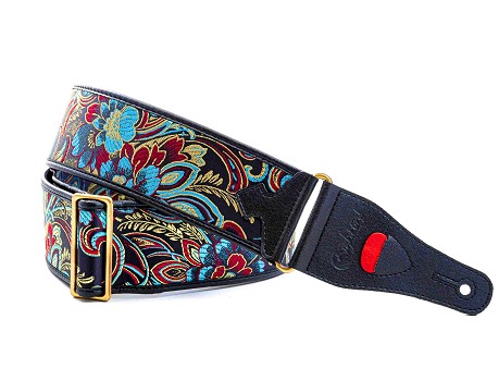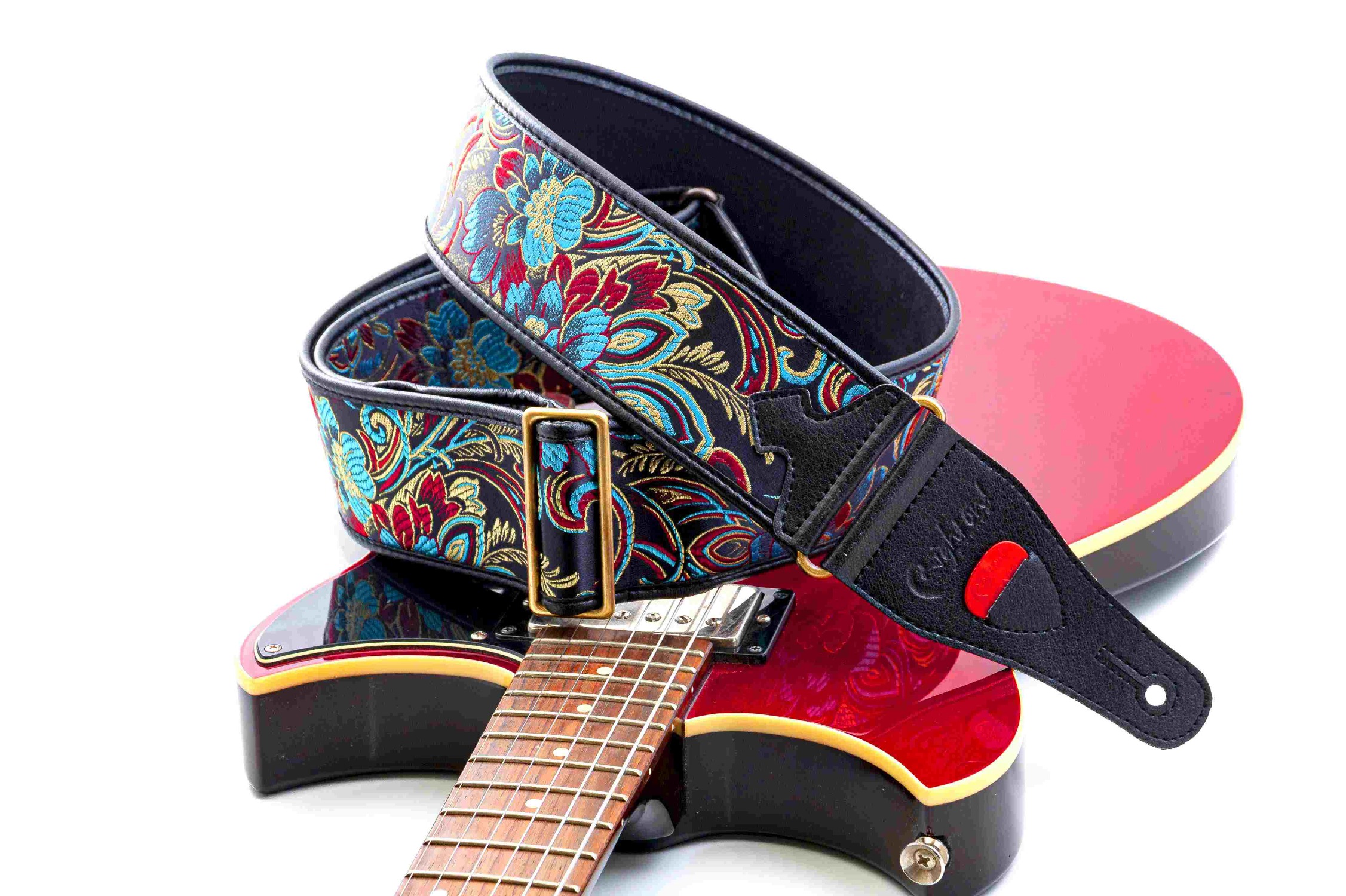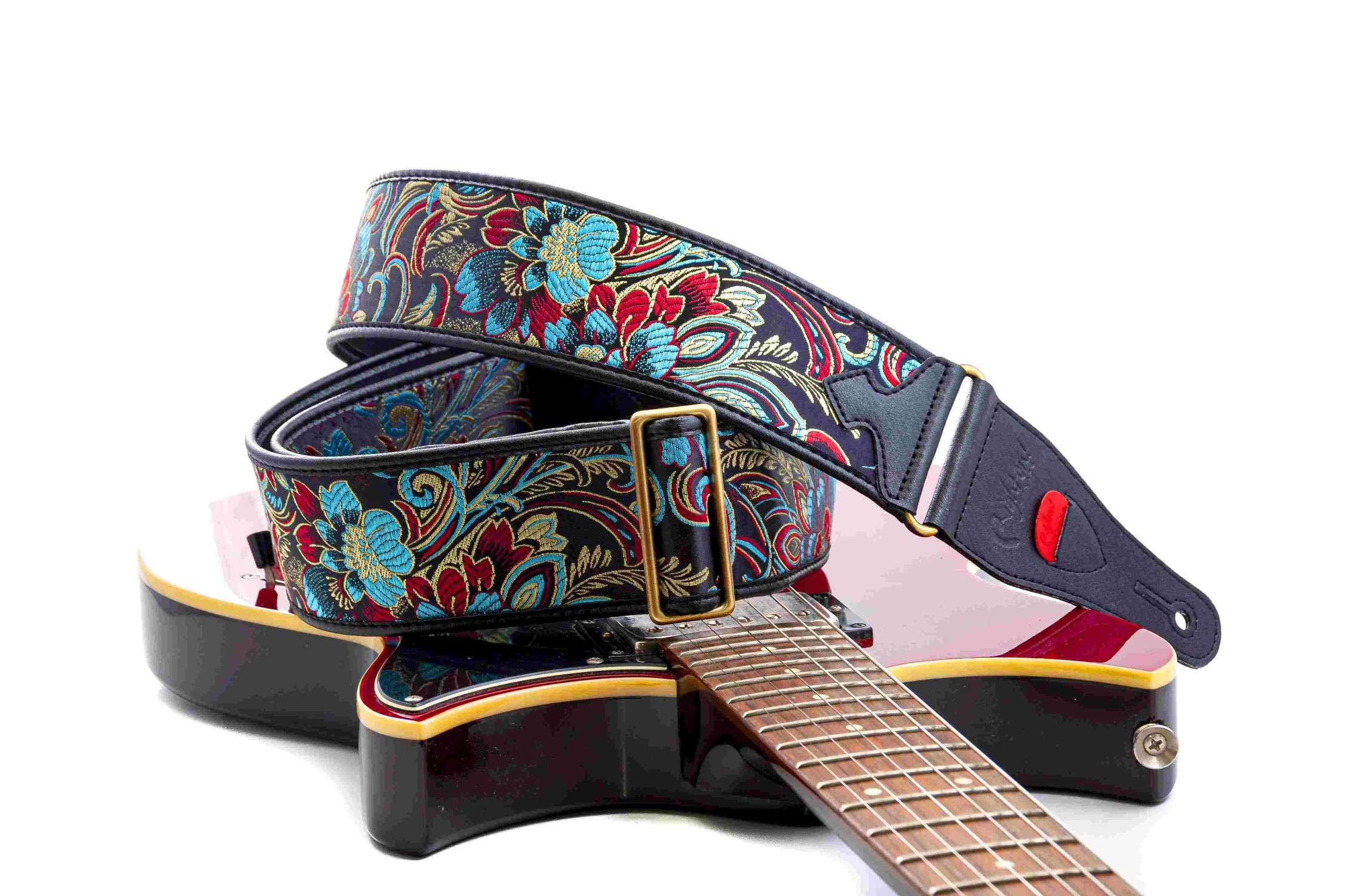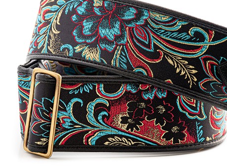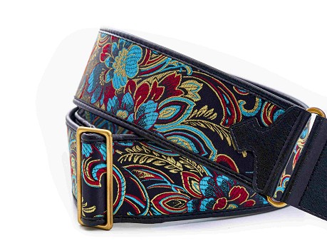 Beppu II Guitar Strap: Beppu (別府市; Beppu-shi) is the Japanese city of hot springs, known for its "hells on earth" and its unique baths found nowhere else in the world. Beppu boasts the largest number of "onsen" (steam vents rising from the earth) in all of Japan, as well as the highest volume of hot water globally. We wanted to dedicate a guitar strap to this fascinating place and found a spectacular fabric that captures that characteristic Japanese style. This strap, with its black background and embroidered botanical motifs, is an absolute beauty, capable of enhancing even the simplest guitar, if one ever considers their guitar plain ;) And if that's the case, this strap will certainly make your guitar look much more elegant.