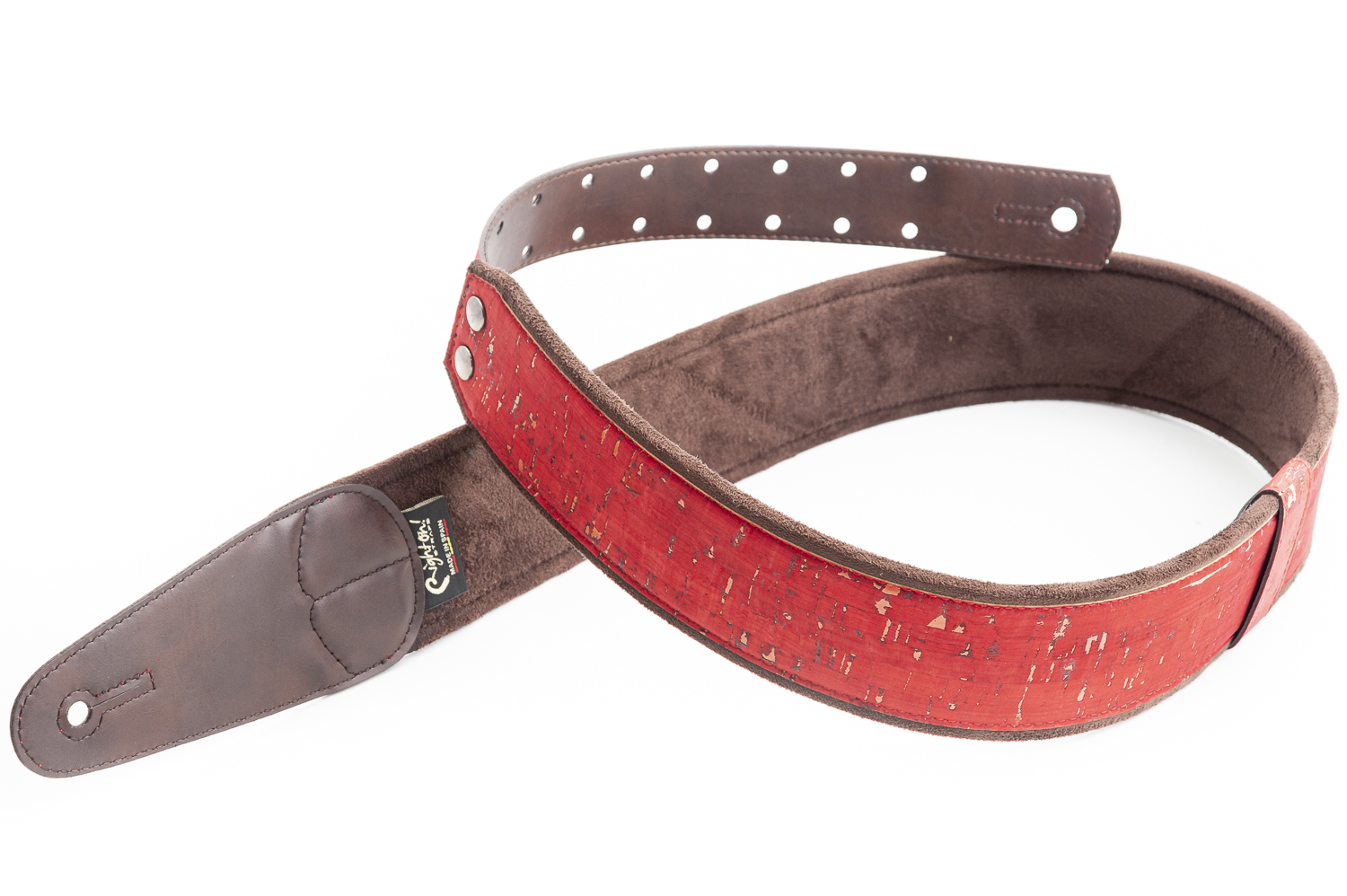 Cork Red Guitar Strap: Sometimes, we let our creativity flow and experiment with new and surprising materials. This is the case with our "Cork" straps, made from cork. Cork is a natural, eco-friendly, and sustainable material derived from the cork oak tree, traditionally used in the production of wine stoppers, shoes, sofas, and clothing. So why not use it for our guitar straps as well? At RightOn!, we started using this material in 2013, and we are proud to be the first to do so. Besides being aesthetically pleasing, cork is highly durable and waterproof.