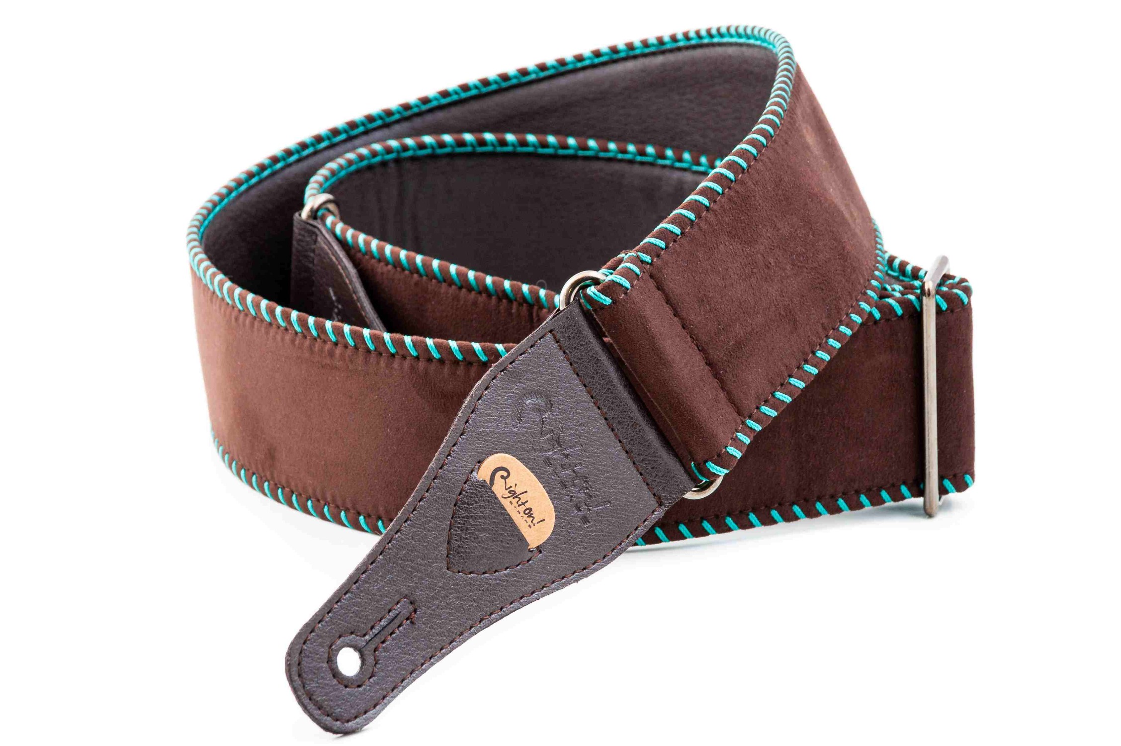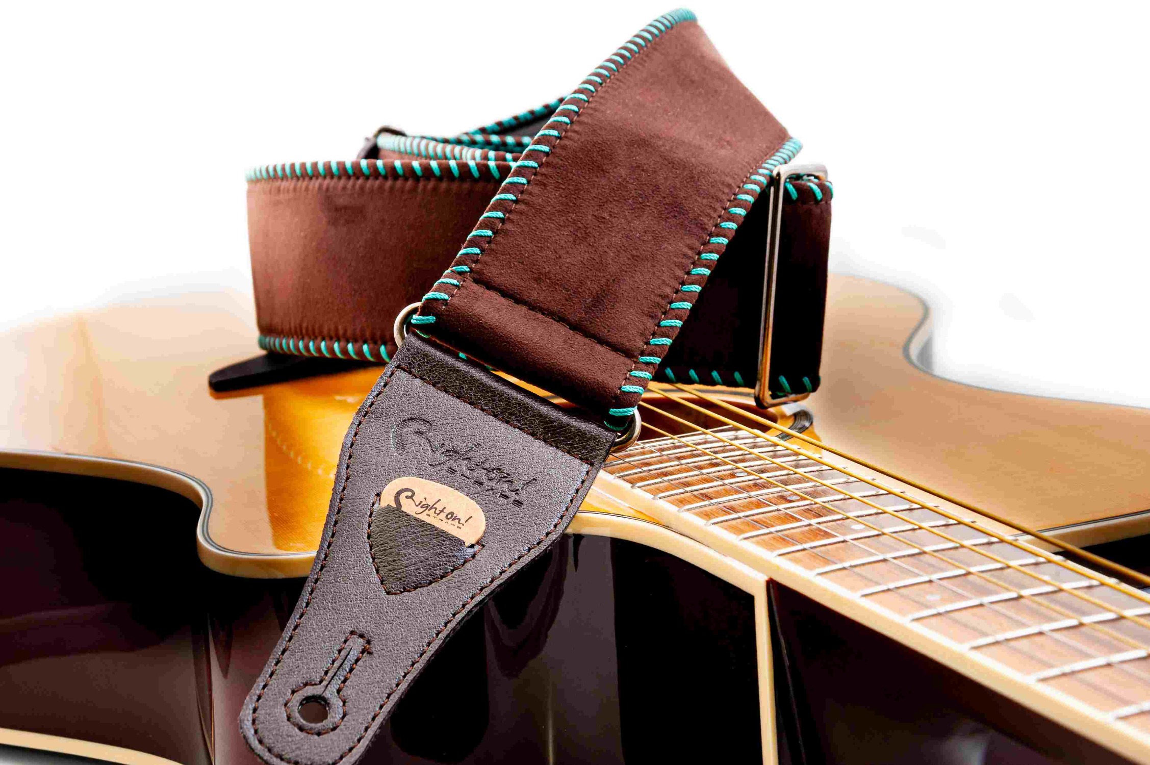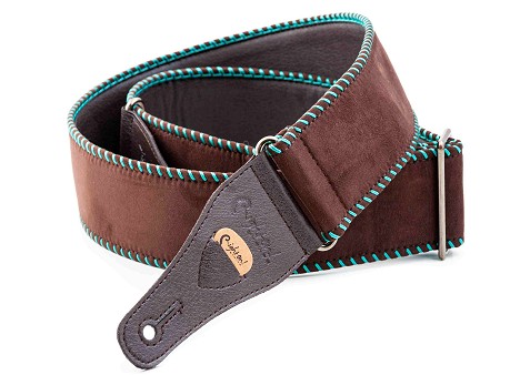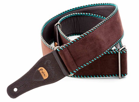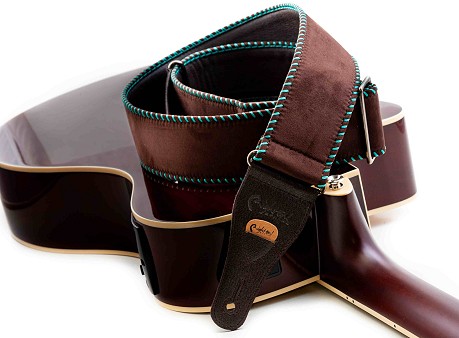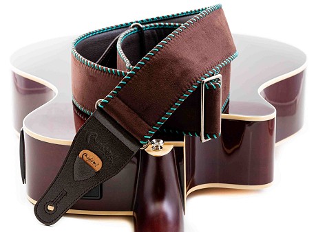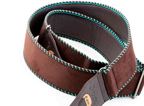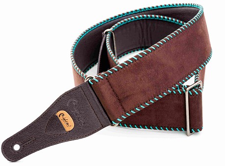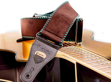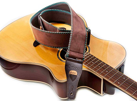 The Yeehaw strap is soft with 6 cm width, perfect for acoustic guitar. It offers a grip slightly slicker than what we usually use, featuring wide decorative saddle stitch.