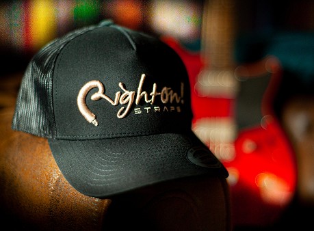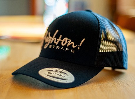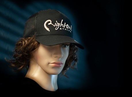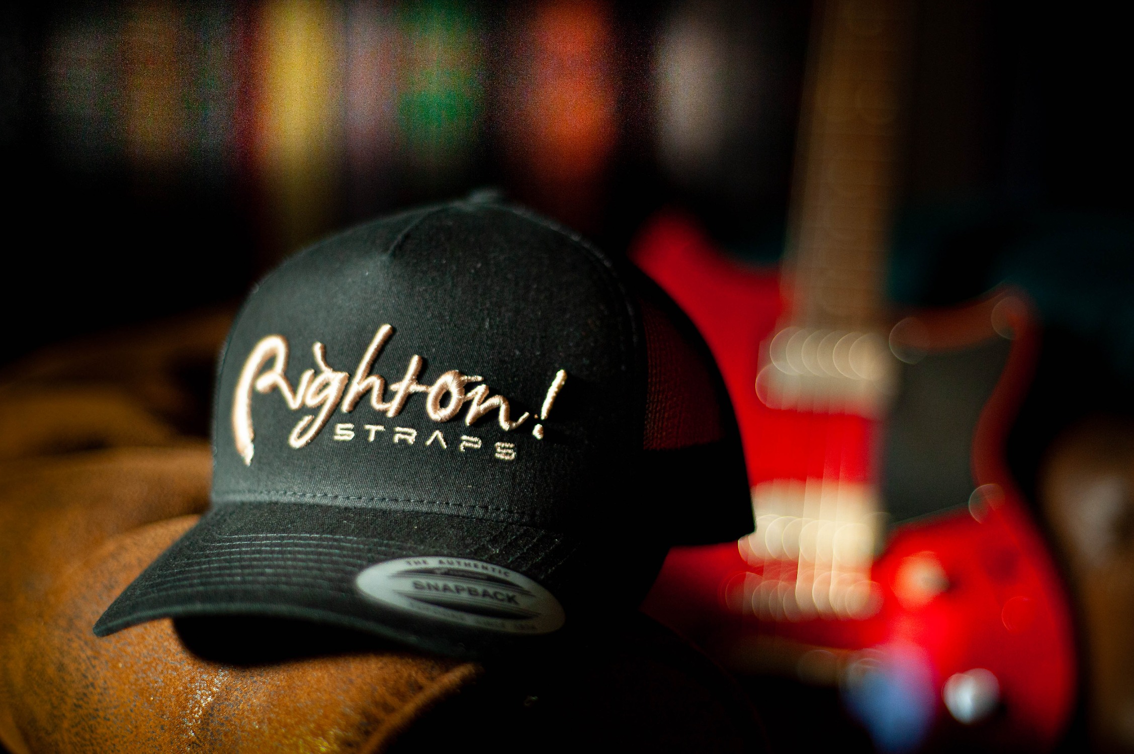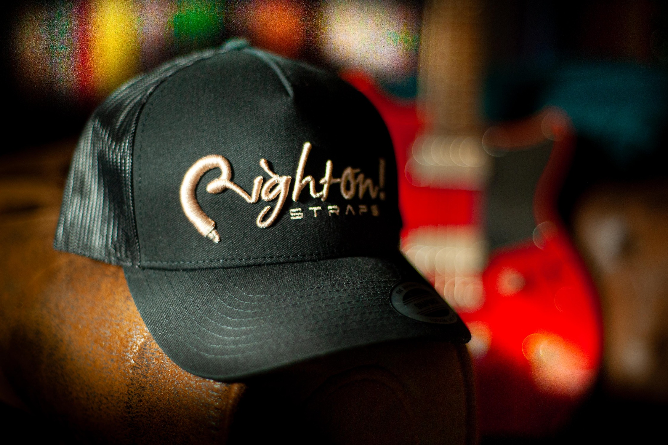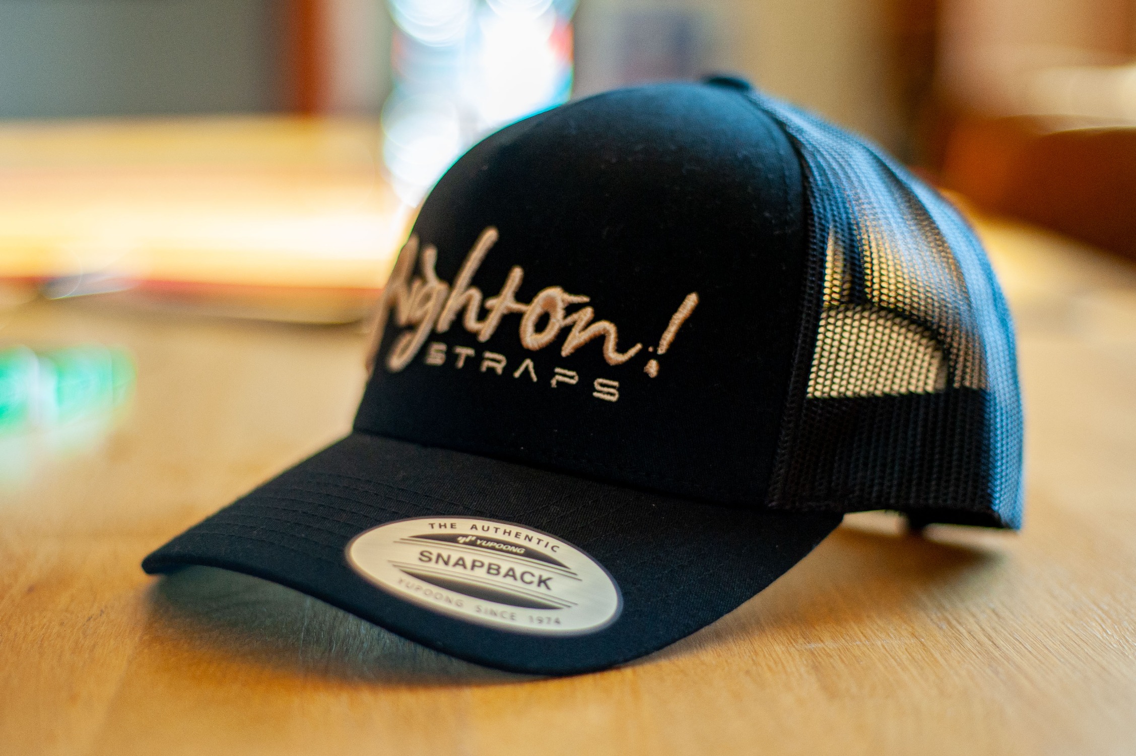 Casquette retro trucker noire en maille respirante avec broderie beige du logo officiel RightOn! Straps. Parfaite pour tout le monde.