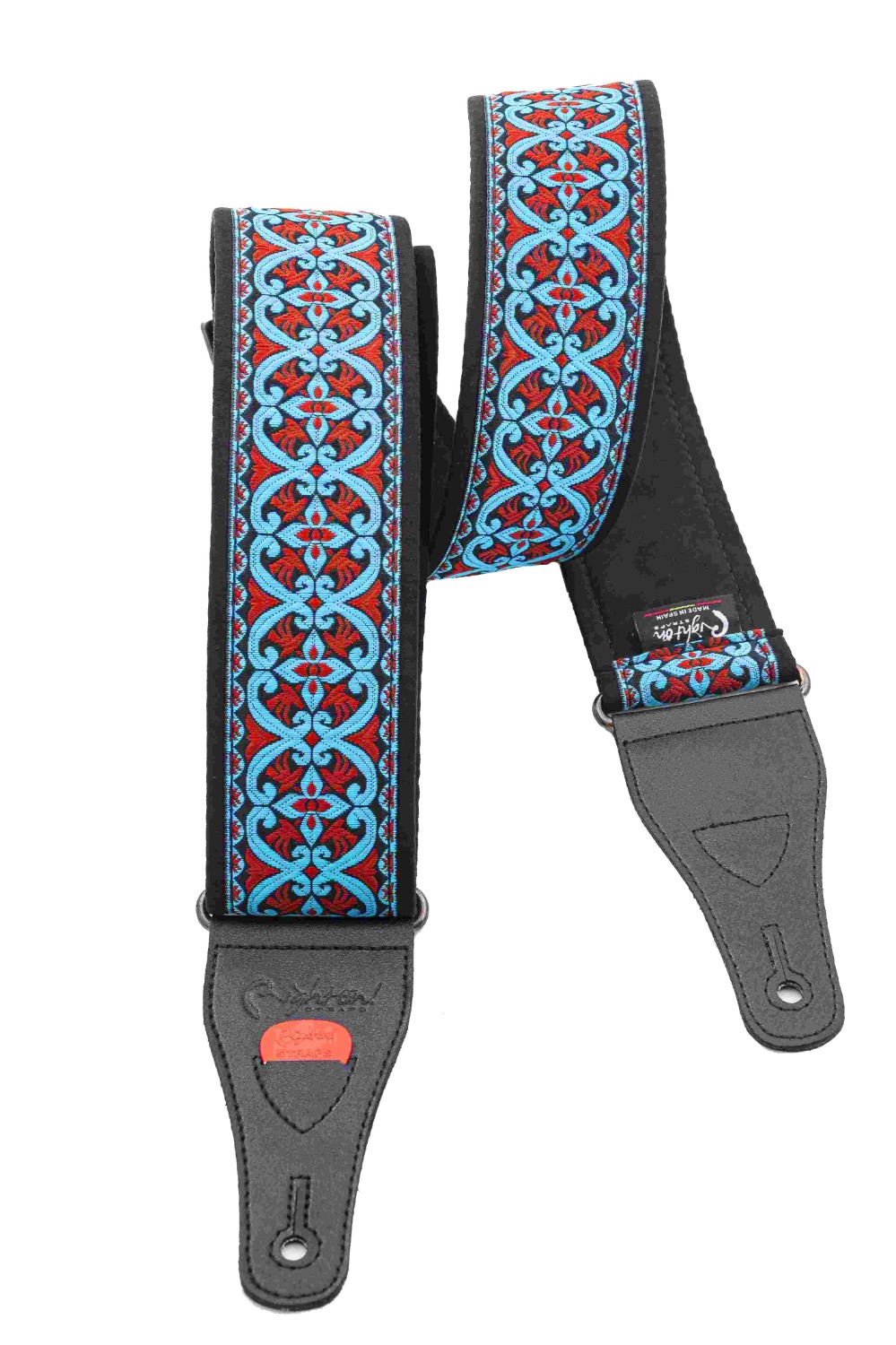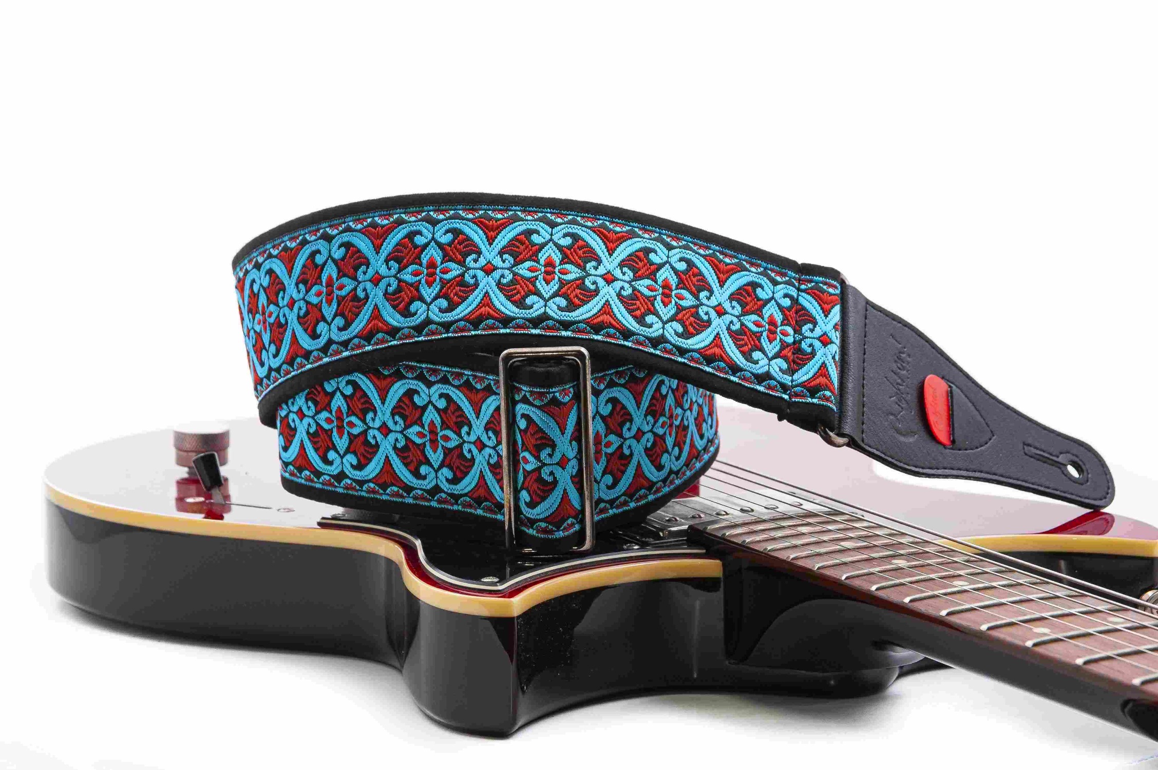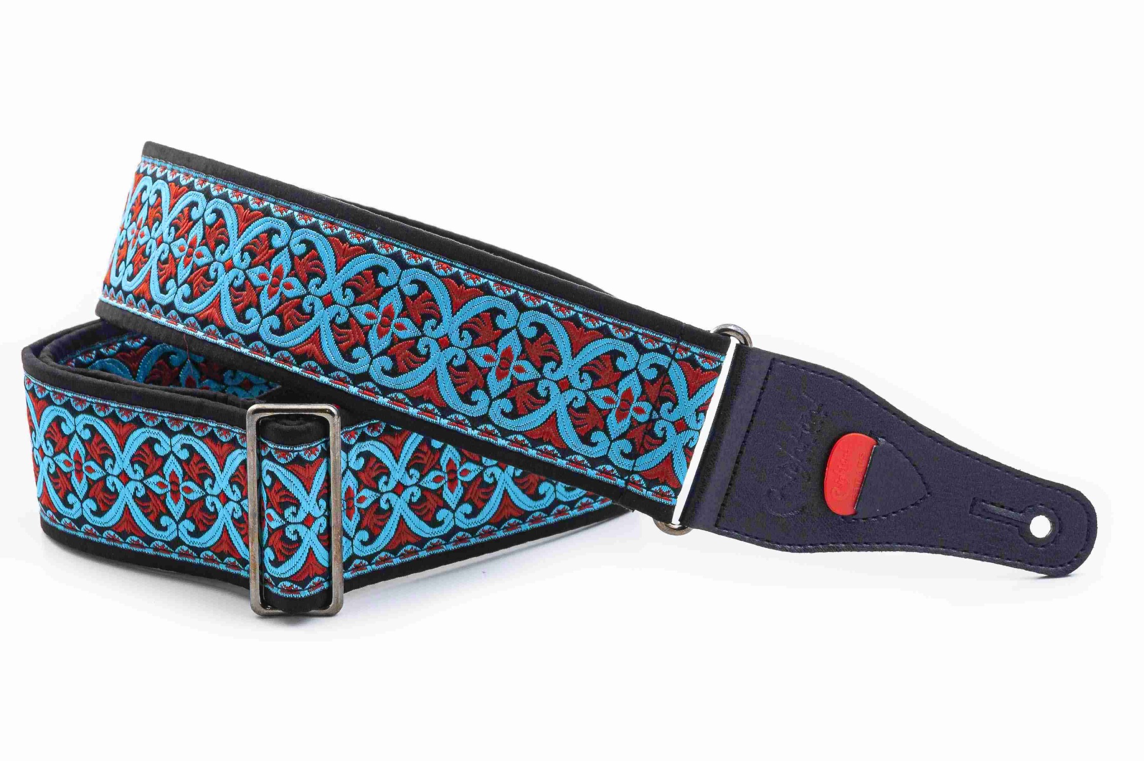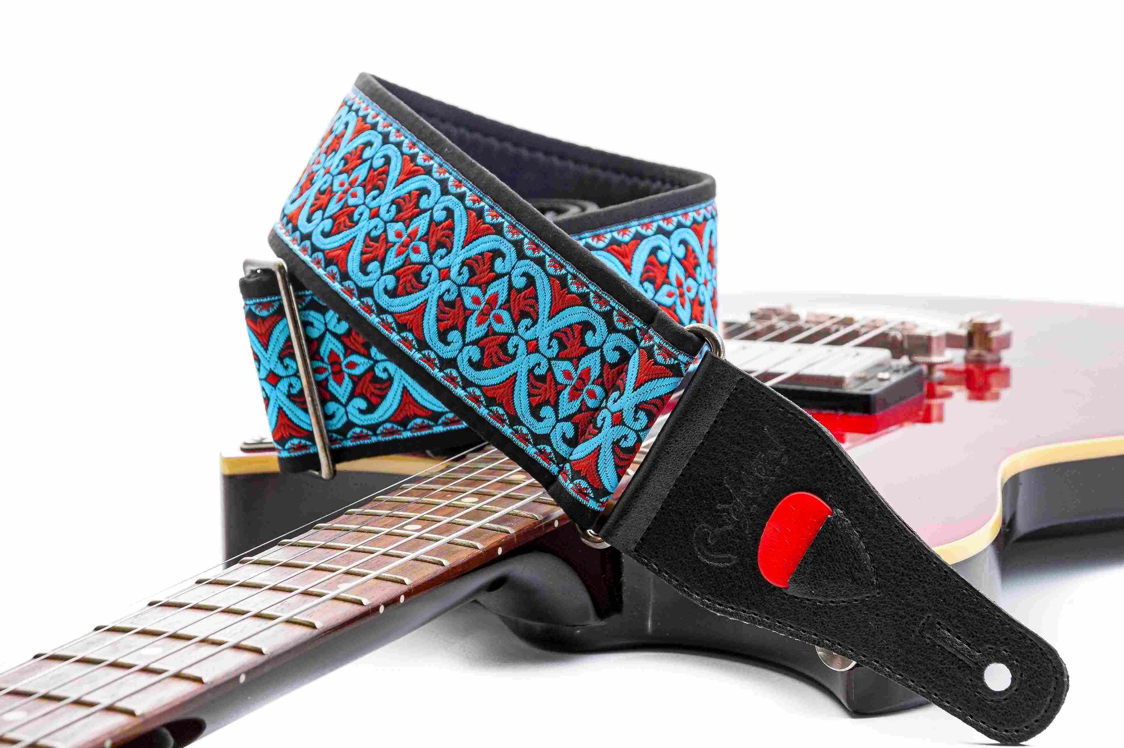 Sangle de Guitare Fillmore II: Cette sangle pour guitare et basse, d'une largeur de 6 cm, présente une doublure intérieure en microfibre antidérapante et un rembourrage en latex de faible densité de 2 mm, ornée de broderies en jacquard de style vintage.