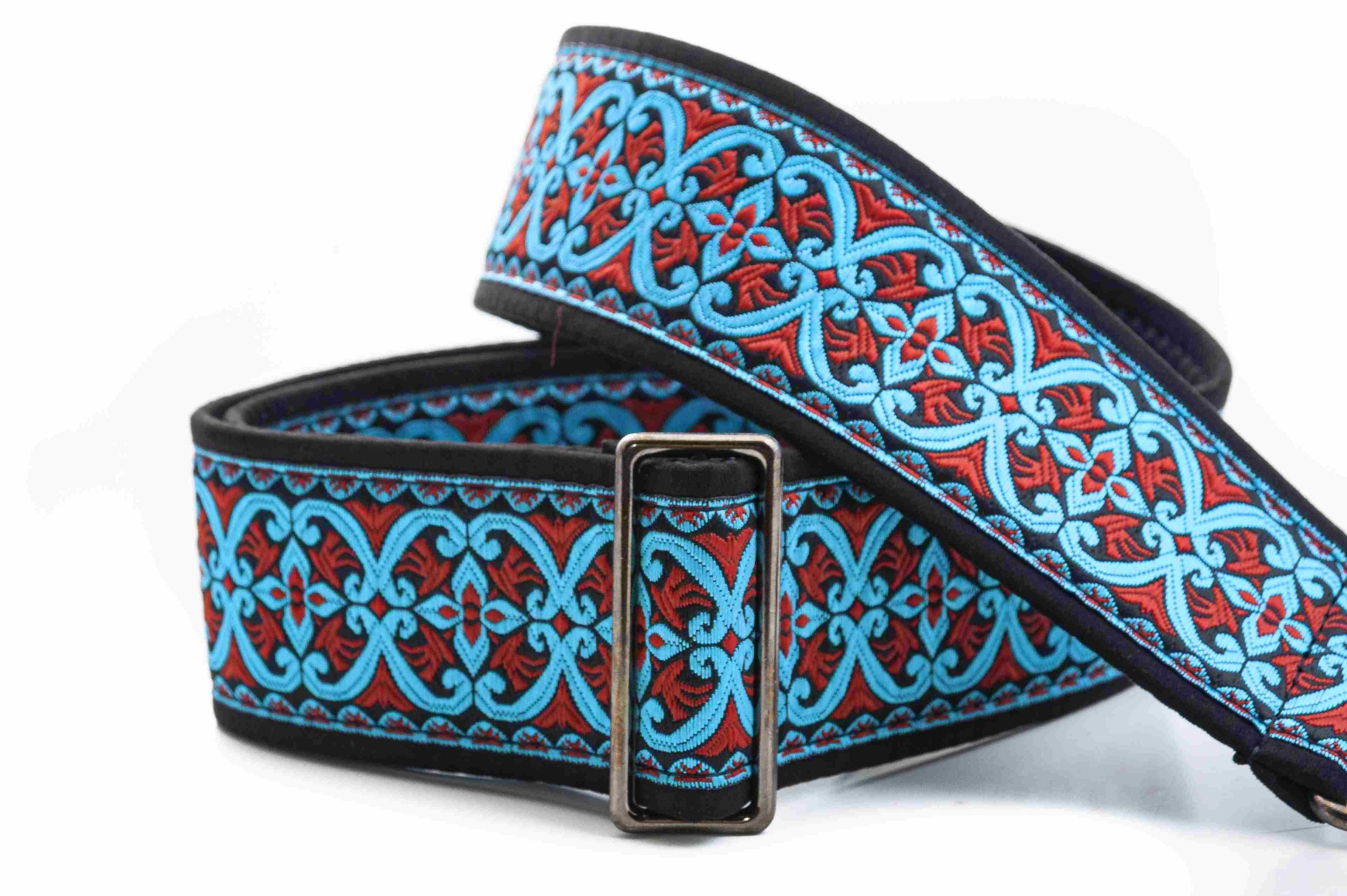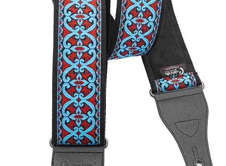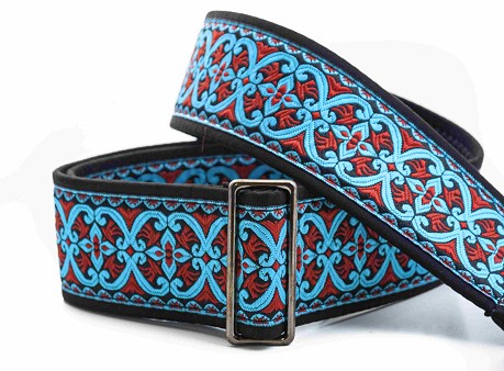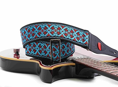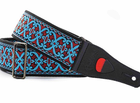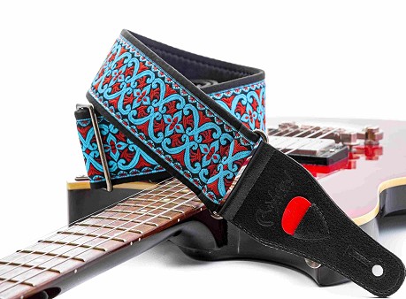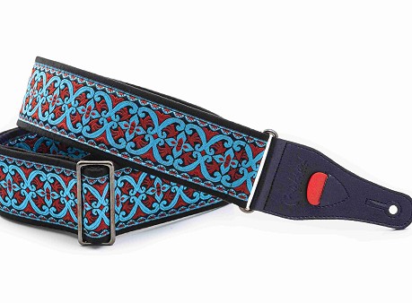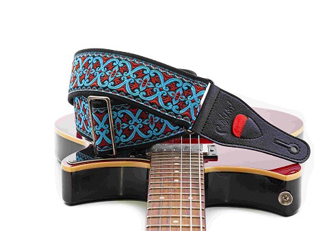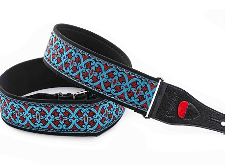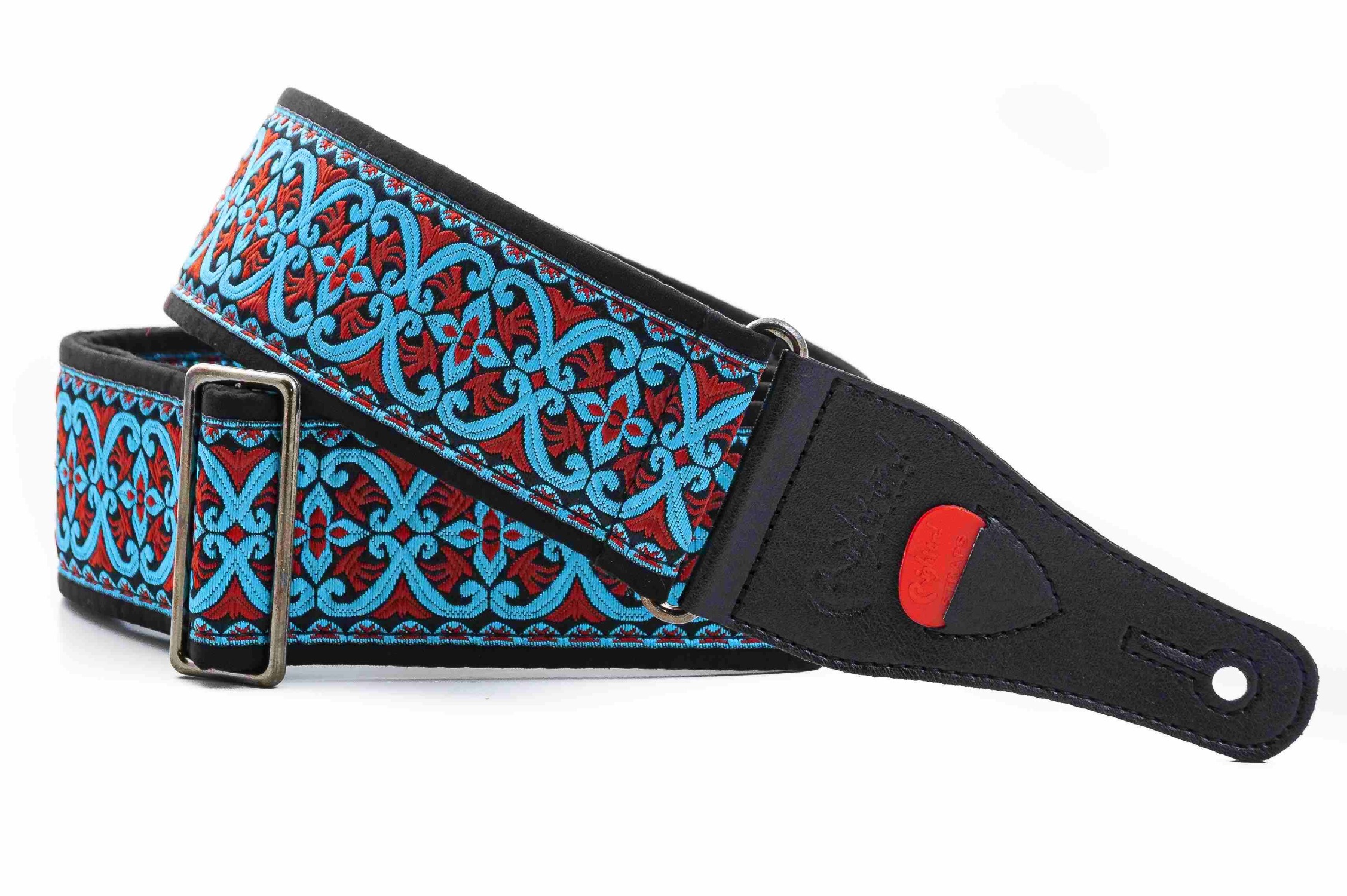 Sangle de Guitare Fillmore II: Cette sangle pour guitare et basse, d'une largeur de 6 cm, présente une doublure intérieure en microfibre antidérapante et un rembourrage en latex de faible densité de 2 mm, ornée de broderies en jacquard de style vintage.