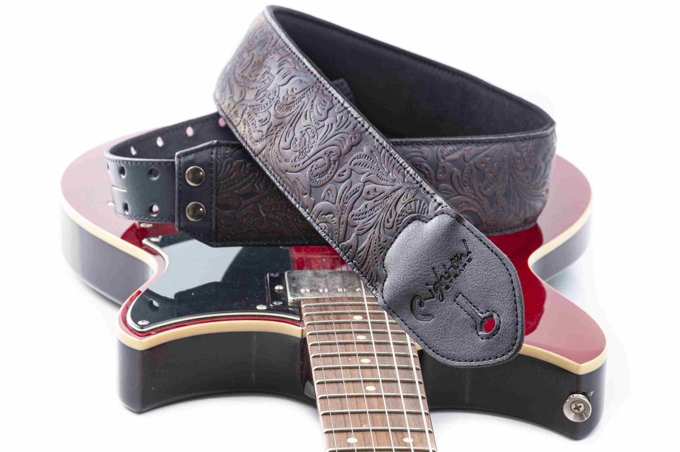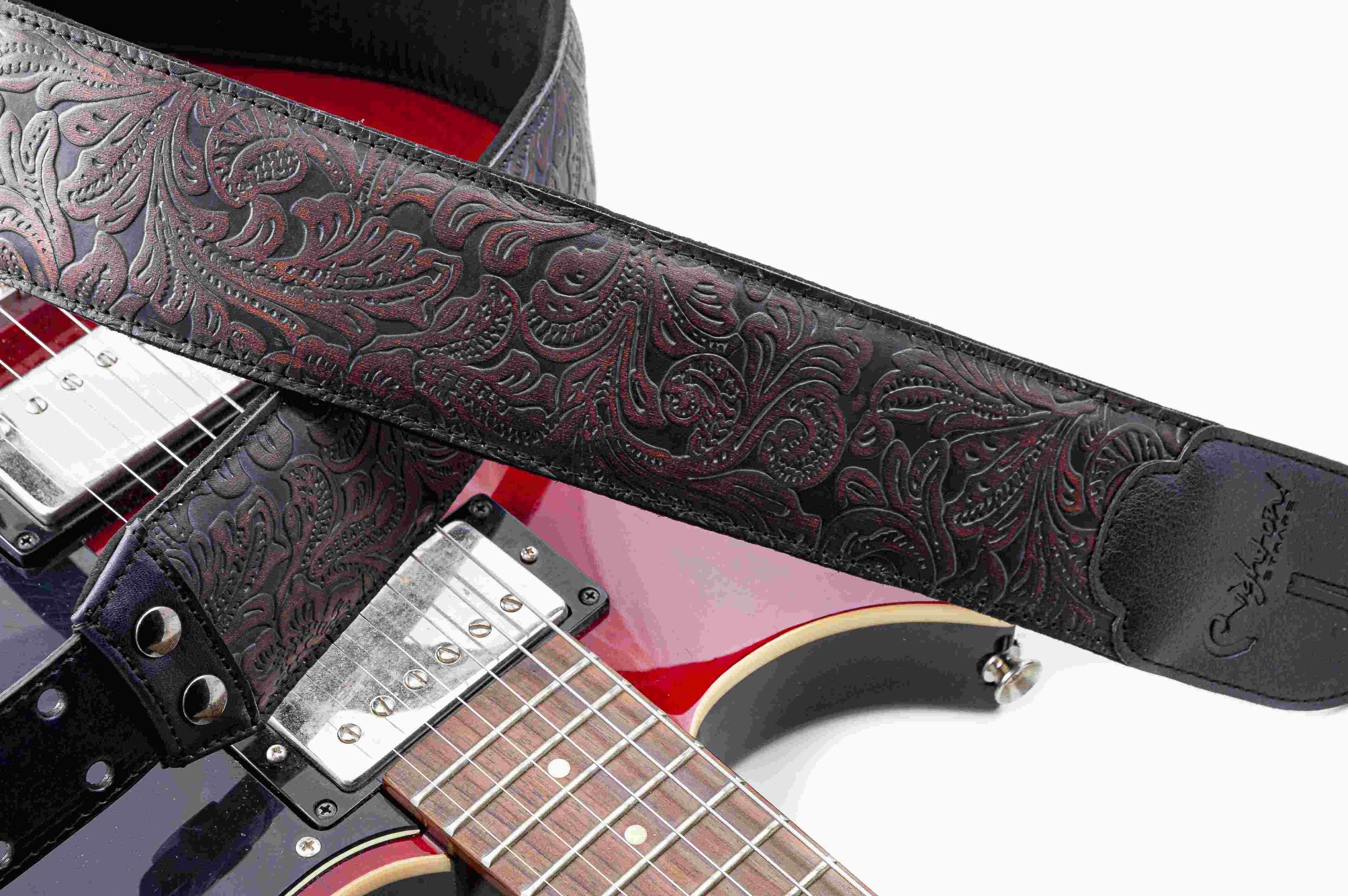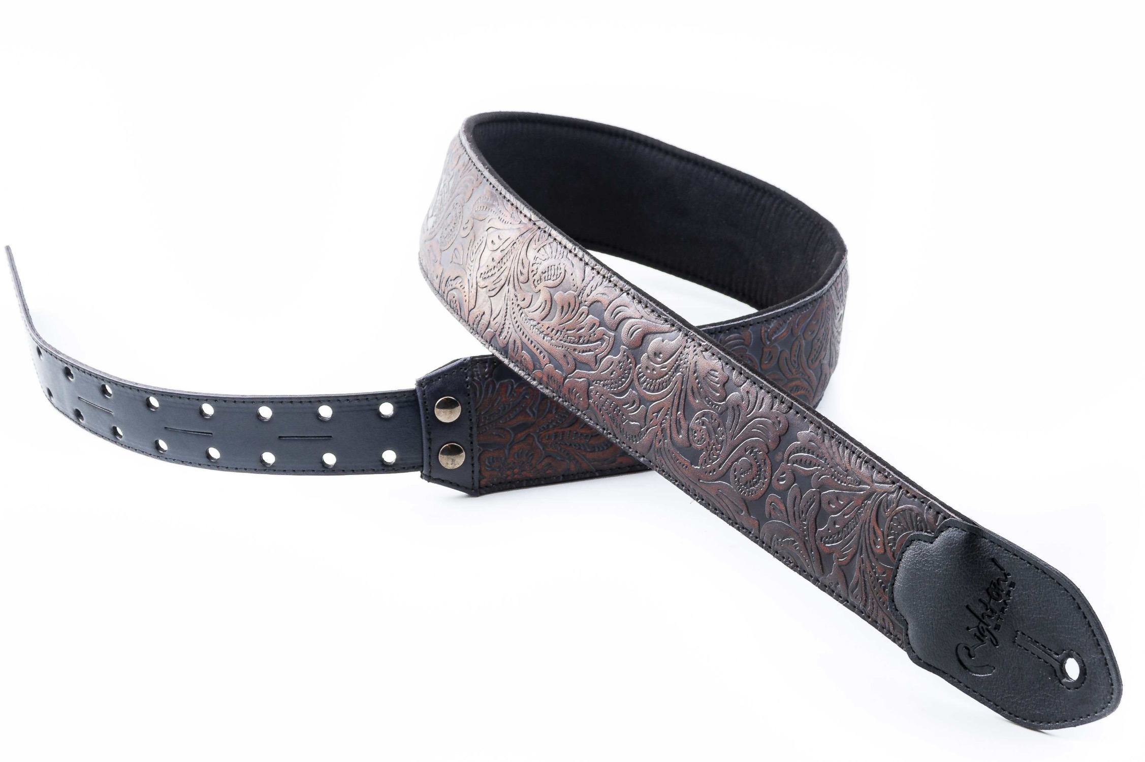 Correa de guitarra de piel Blackguard Black: Cuando creamos esta correa de piel para guitarra, teníamos en mente un diseño vintage western, algo "canalla", con piel trabajada y grabada que destacara por esos detalles únicos que la hacen tan especial. Nos costó, pero finalmente dimos en el clavo, o al menos eso creemos. Esta correa está pintada y envejecida a mano, lo que convierte cada pieza en algo único.