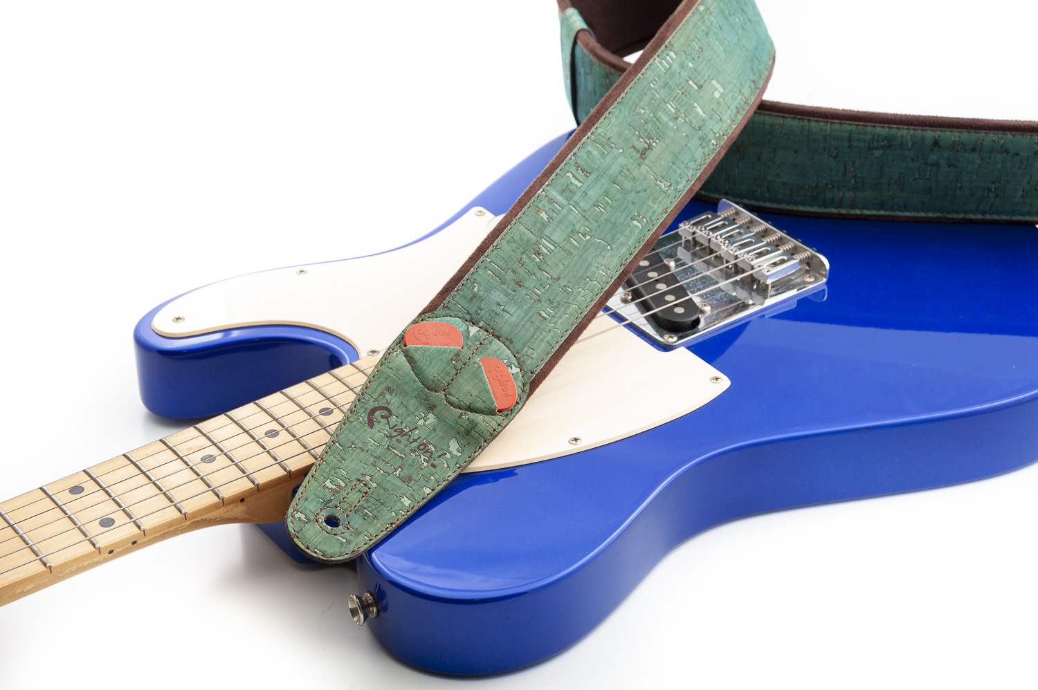 Correa de Guitarra Cork Teal: A veces, nos dejamos llevar por la creatividad y experimentamos con materiales novedosos y sorprendentes. Este es el caso de las correas "Cork", hechas de corcho. El corcho es un material natural, ecológico y sostenible que proviene del alcornoque y que tradicionalmente se ha utilizado en la fabricación de tapones de vino, calzado, sofás y ropa, entre otros. Entonces, ¿por qué no utilizarlo para hacer nuestras correas? En RightOn!, comenzamos a usar este material en 2013 y estamos muy orgullosos de ser los primeros en emplearlo. Además de ser estéticamente atractivo, el corcho es altamente resistente e impermeable.