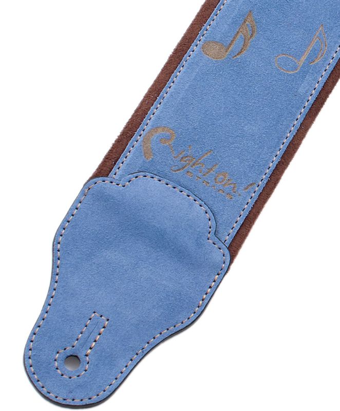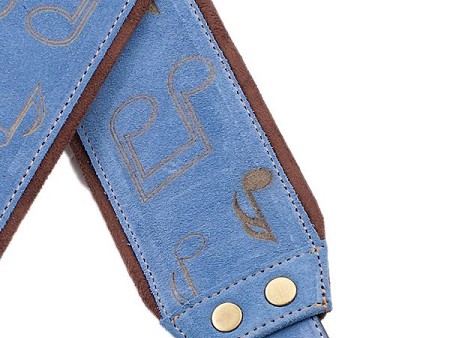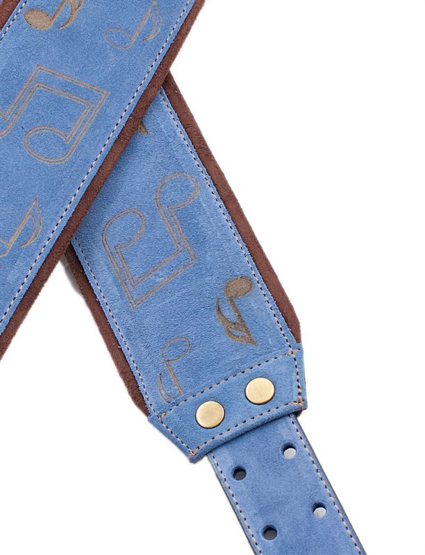 Correa para guitarra y bajo púrpura fabricada en España en piel con grabado láser de notas musicales, forro de microfibra, sistema de ajuste RAS y portapúas integrado.